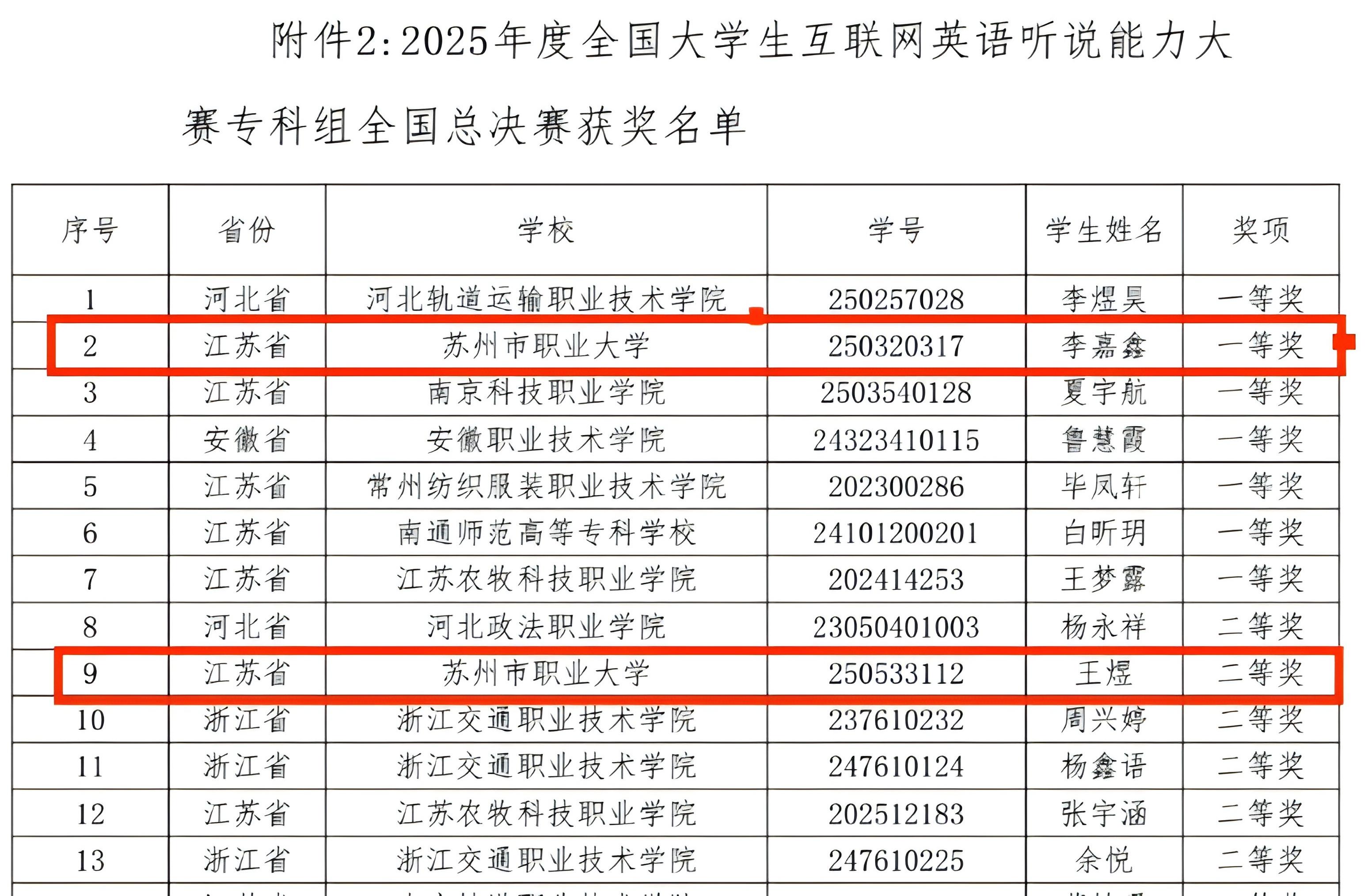 4月9日,2025年度全国大学生互联网英语听说能力大赛全国总决赛在南京林业大学举行。我校外国语学院学生李嘉鑫(指导教师:卞浩宇)和王煜(指导教师:钱鑫)分别荣获全国总决赛专科组一等奖和二等奖。